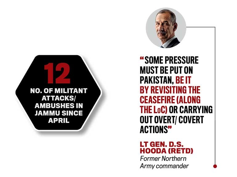 The hilly Doda district has been hit hard—the past two months have seen almost half a dozen terror strikes. The area falls under the province of the army’s Delta forces, has mountains as high as 14,500 ft covered with dense coniferous forests spread over 1,400-odd sq. km where militants can find shelter. The local population, a mix of Hindus and Muslims, have not forgotten their brutal past. Scores of them had shifted from the villages to safer zones like Jammu or other towns during the peak militancy years (1996-2006). The region had seen over a dozen massacres of civilians, most of them Hindus. Several people, including three local sarpanches, admitted to india today that fear had again upended their lives. “Earlier, we used to stay out till 10 pm,” says a sarpanch from Bhalesa village. “But now, we return home by 7, and switch off the lights.”